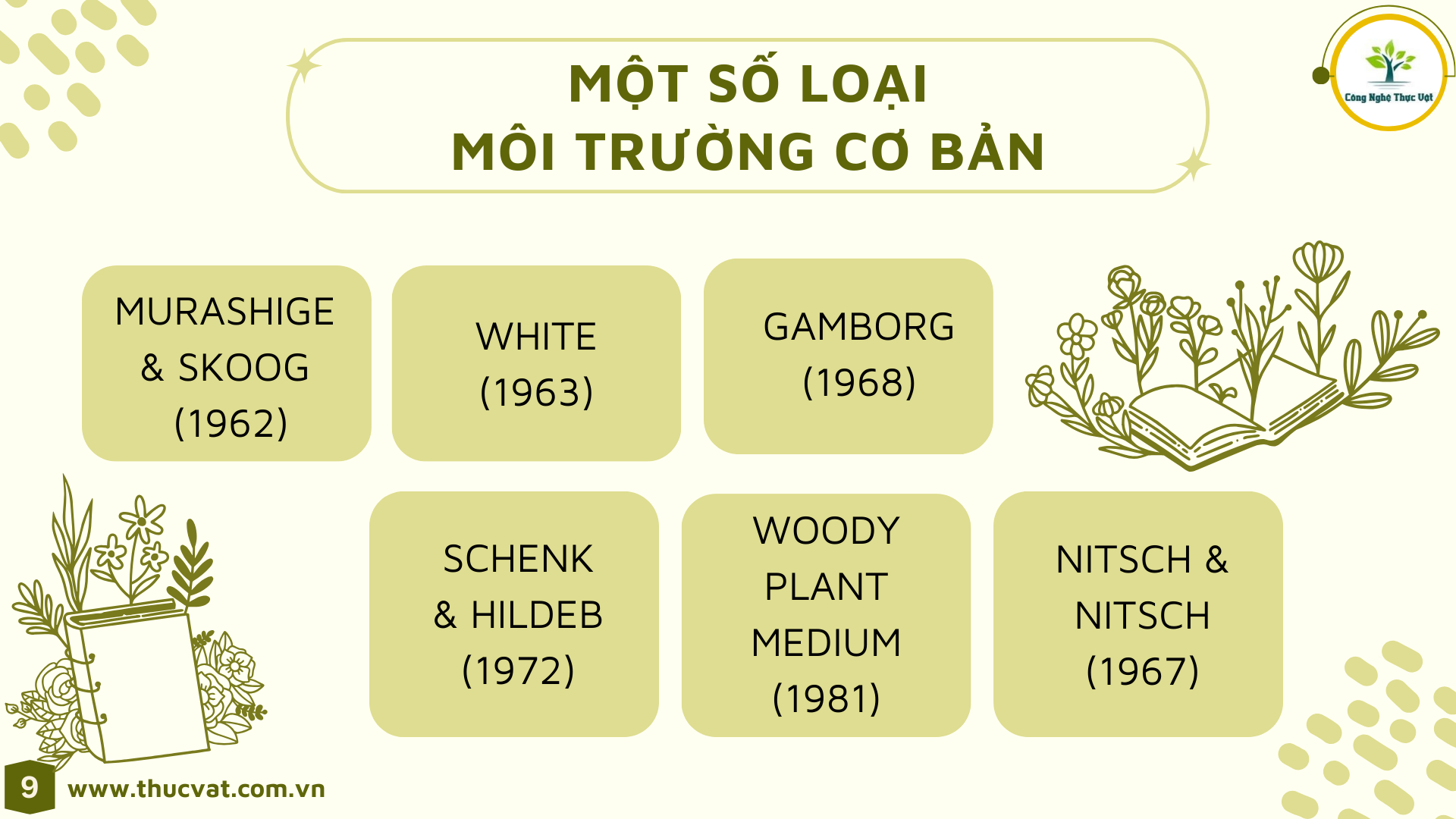 Môi trường nuôi cấy mô pha sẵn, các thành phần khoáng vi lượng và đa lượng (micro/macro elements), muối khoáng (mineral salts), các loại vitamines, amino acids, các loại đường (sugar), các chất điều hòa sinh trưởng thực vật, agar, gelrite, agarose, biochemicals, subtrates, dung dịch đệm buffers, chất kháng sinh.