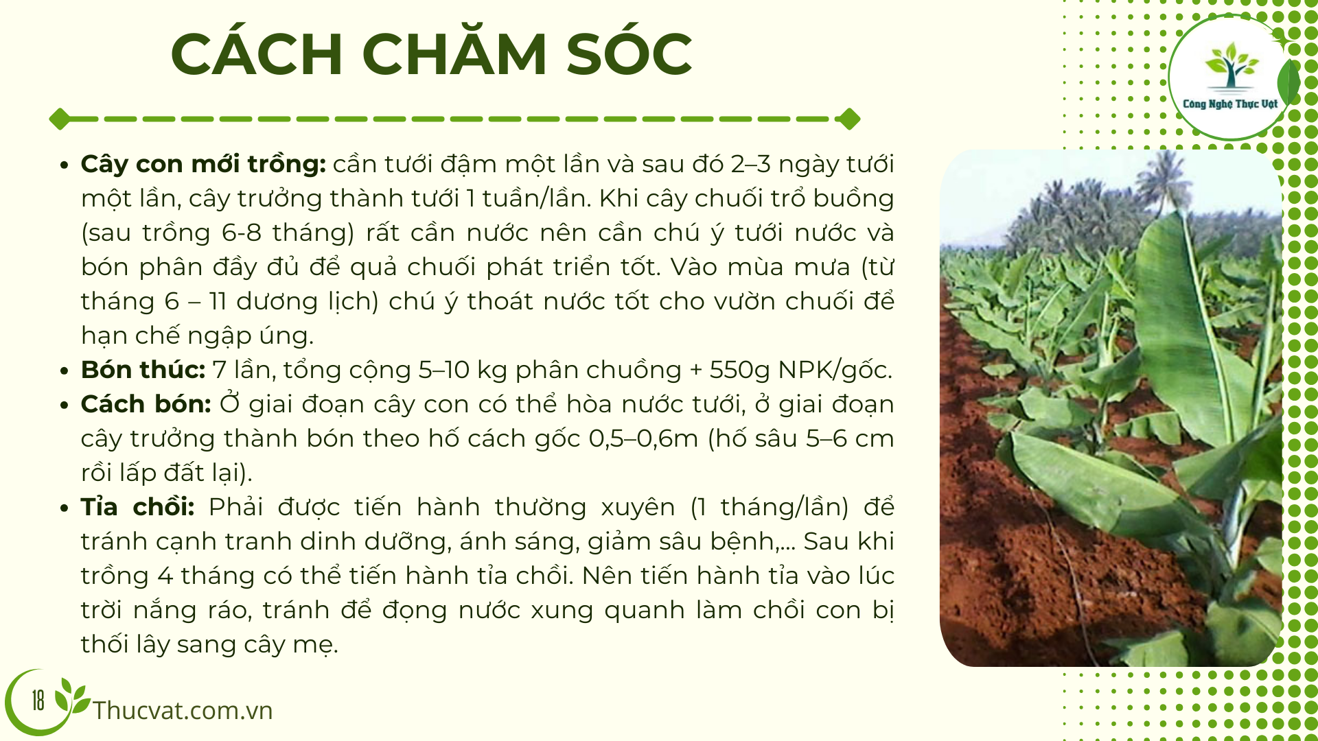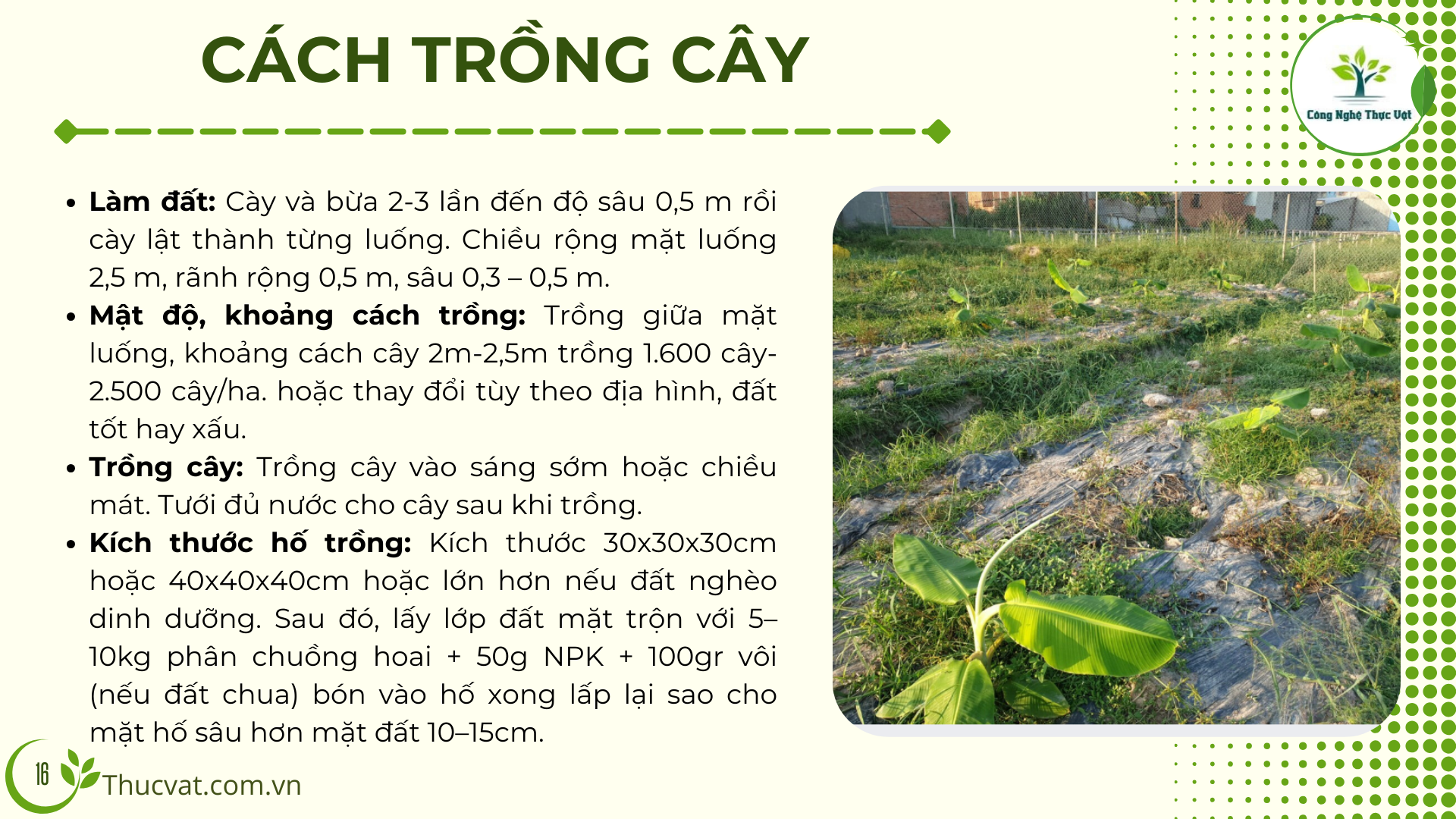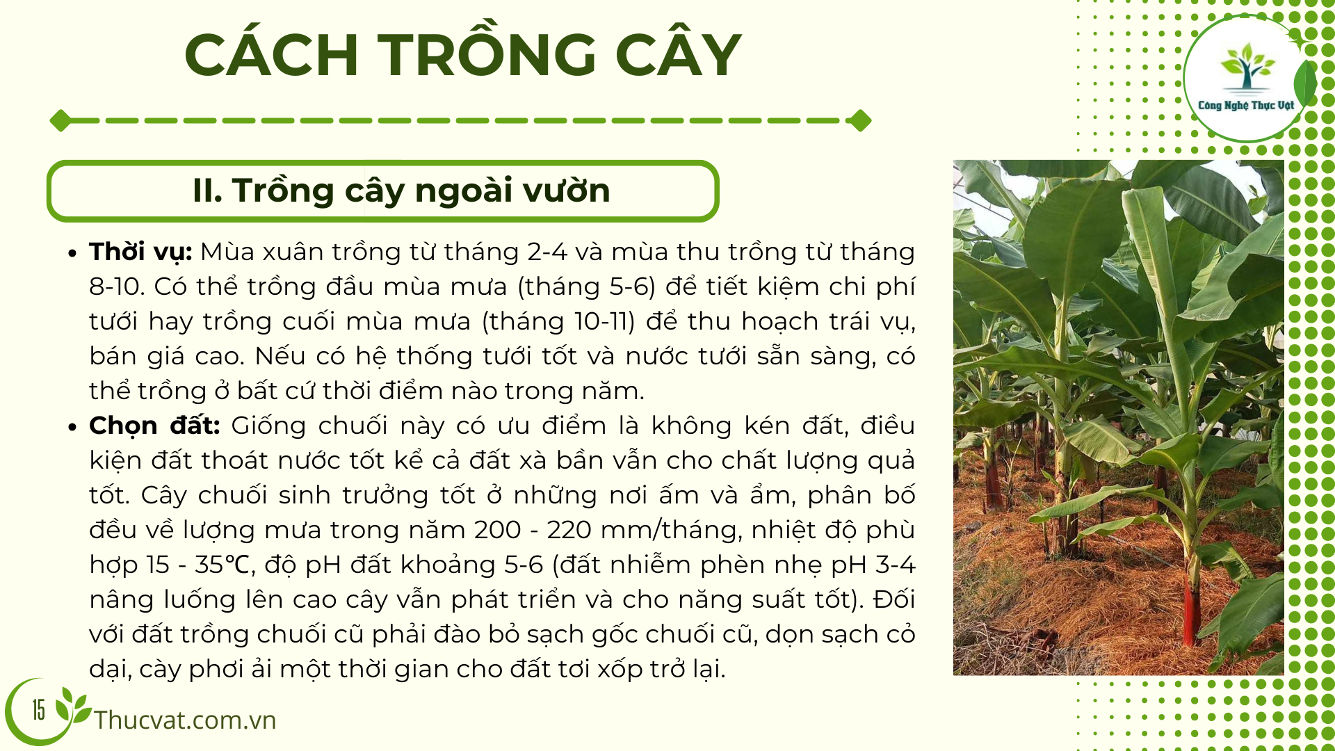 - Đất trồng: Cây Chuối thích hợp trồng ở vùng đất có tầng canh tác sâu từ 50cm trở lên, thoát nước tốt, không bị ngập úng.