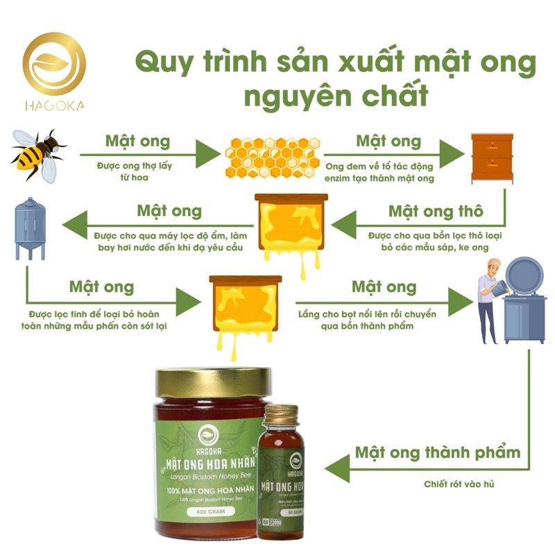 - Mật ong hoa nhãn nguyên chất Hagoka do ong mật đi lấy phấn hoa về tổ tạo thành. Thành phần của mật ong hoa nhãn nguyên chất gồm các loại đường tự nhiên, nước và rất nhiều vitamin và dưỡng chất.
