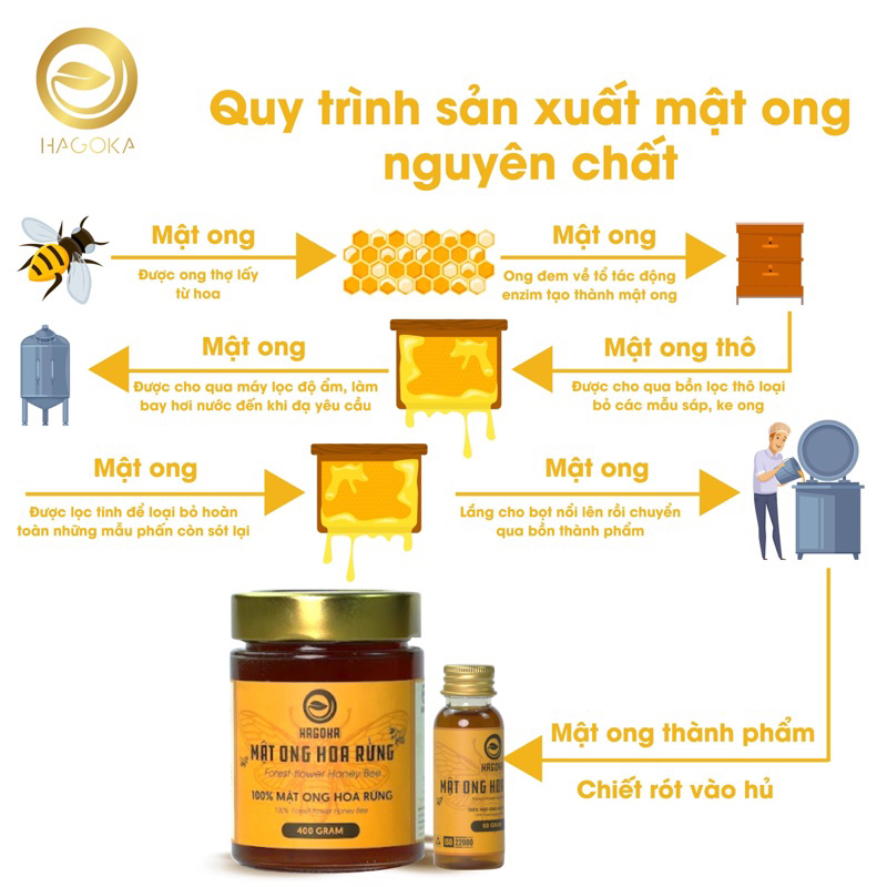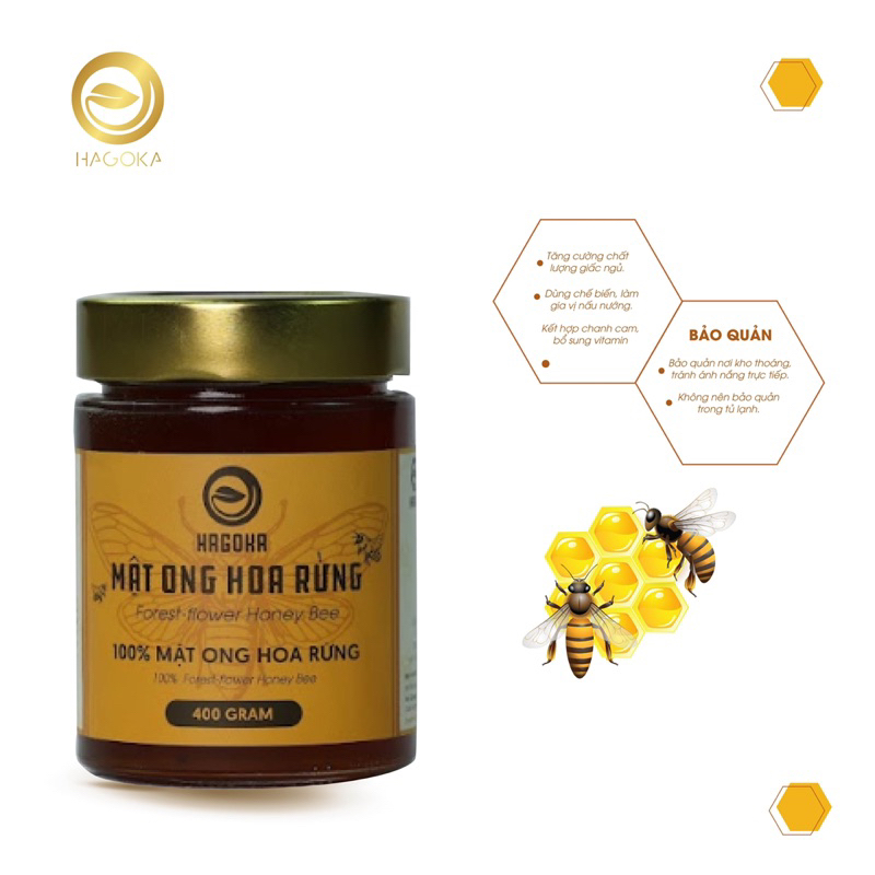- Mật ong rừng nguyên chất Hagoka do ong mật đi lấy phấn hoa về tổ tạo thành. Thành phần của mật ong nguyên chất gồm các loại đường tự nhiên, nước và rất nhiều vitamin và dưỡng chất.
