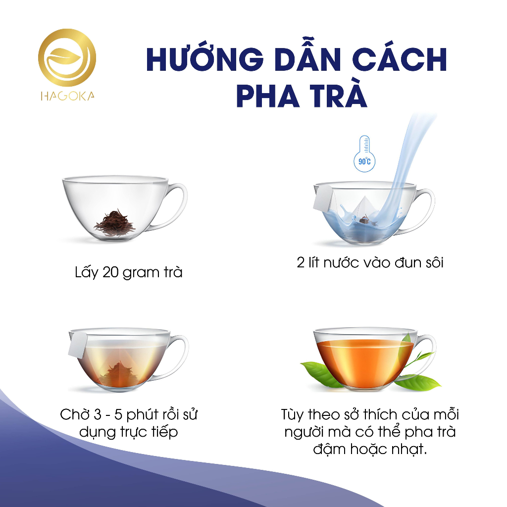 - Lấy 20 gram trà cho vào ấm, sau đó đổ 2 lít nước vào đun sôi, khi vừa sôi đến thì tắt lửa (để lâu quá sẽ mất vị ngon của trà). Tùy theo sở thích của mỗi người mà có thể pha trà đậm hoặc nhạt.