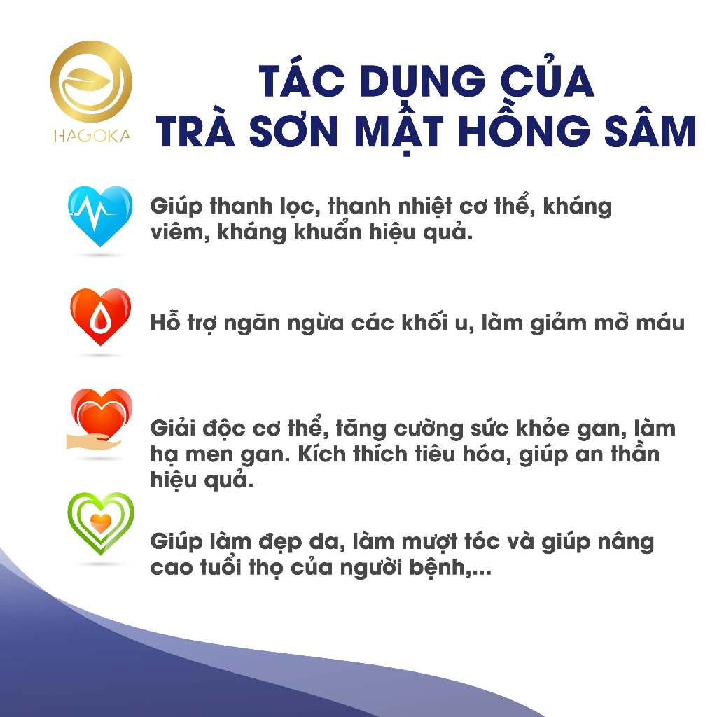 - Uống trà sơn mật hồng sâm sẽ giúp cơ thể thanh nhiệt, giải độc, ổn định huyết áp, hỗ trợ điều trị bệnh tiểu đường,…
